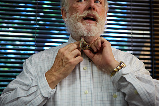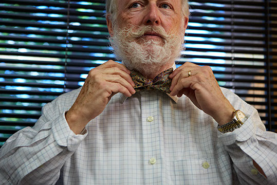 Jim initially wore bow ties just once a week, but patients starting asking him why he wasn't wearing one - so he simply adopted the bow tie as his part of his working wardrobe. In Britain, if doctors wear a tie - it's a bow tie for sanitary purposes.
