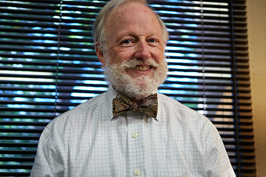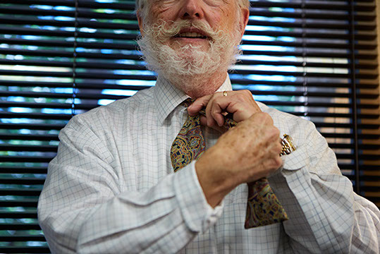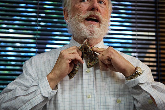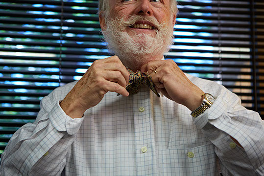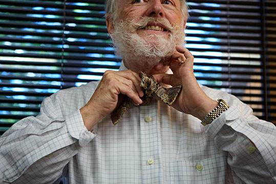Jim initially wore bow ties just once a week, but patients starting asking him why he wasn't wearing one - so he simply adopted the bow tie as his part of his working wardrobe. In Britain, if doctors wear a tie - it's a bow tie for sanitary purposes.
